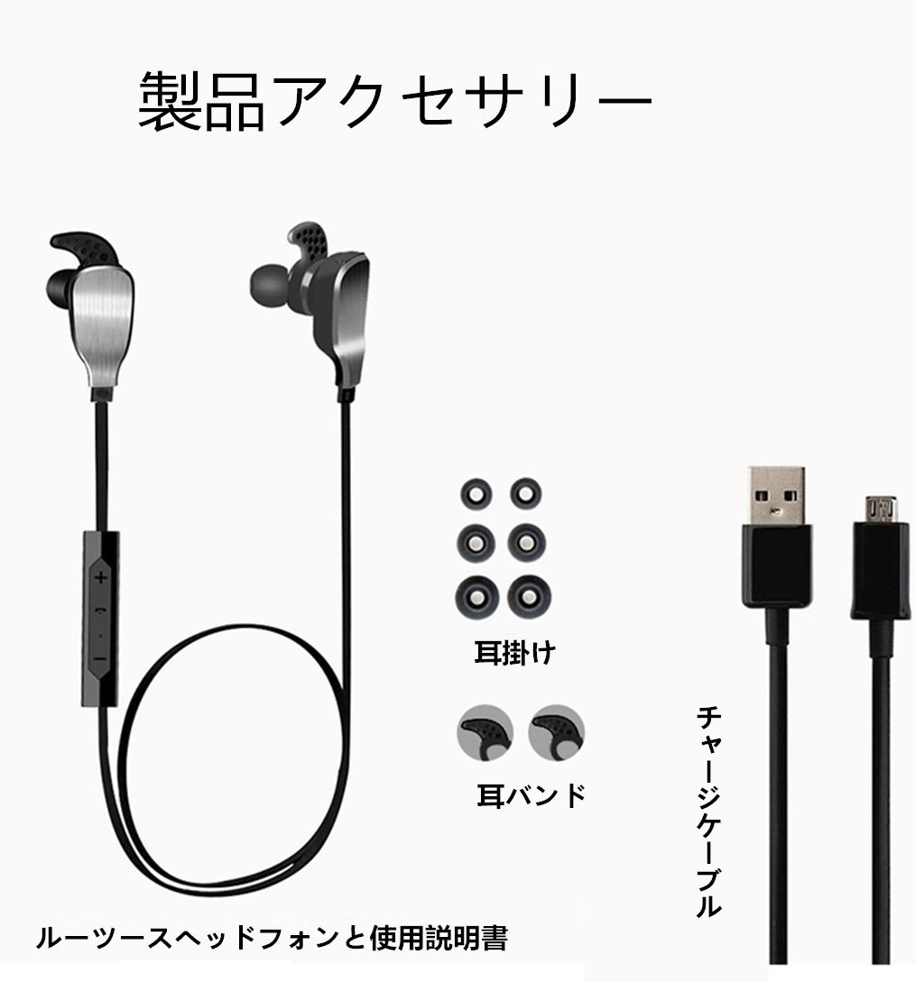 付属品はイヤーピースの替えと充電用USBケーブル、マニュアル。 マニュアルは日本語には対応しない。
