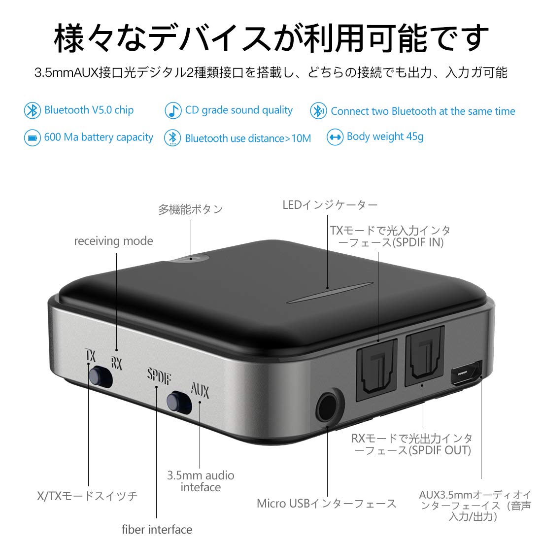 操作インターフェースはシンプルで、電源ボタンの他はトランスミッター機能とレシーバー機能を切り替えるボタン、音楽入出力をS/PDIFとAUXで切り替えるボタンがついているだけ。入出力インターフェースは3.5mmAUXの入出力ポートとS/PIDFの入力と出力ポートが1個ずつ、電源入力用のmicro-USBコネクタを備える。