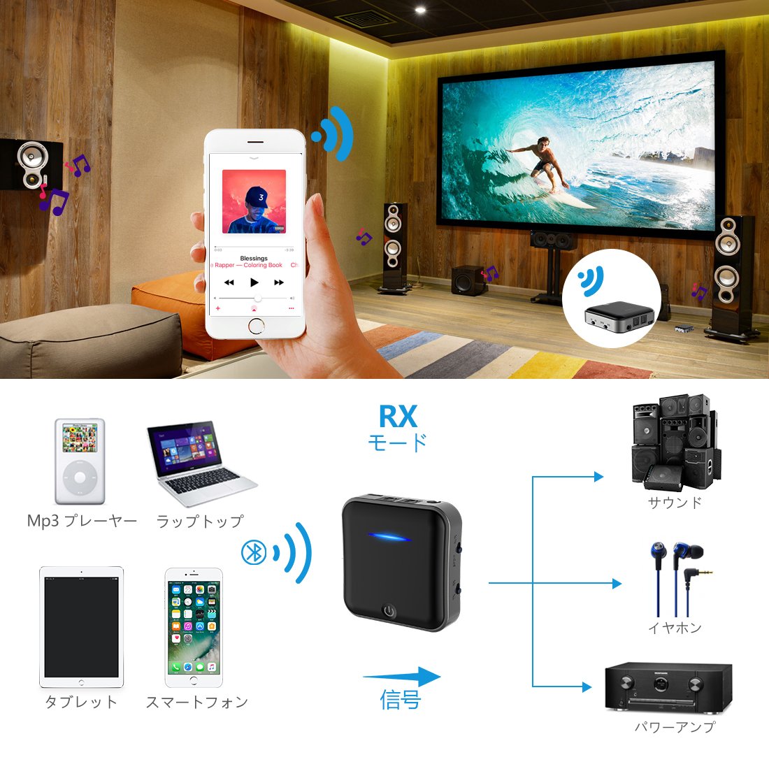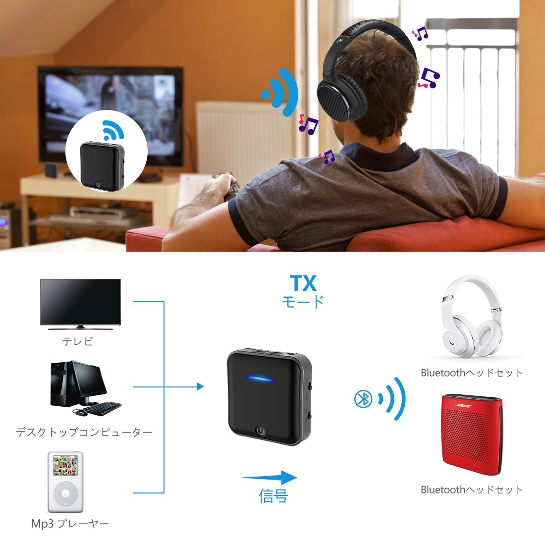 QualcommのワイヤレスチップCSR8675を搭載してaptX HD / aptX LLといった上位コーデックに対応したワイヤレスオーディオレシーバー/トランスミッター。レシーバーとして高性能なスマホ、デジタルオーディオプレーヤー(DAP)から高音質コーデックを使ってイヤホン・スピーカーに音楽を出力できるレシーバーとして使えるだけなく、反対にPCやコンポから入力された音楽をBluetooth対応ヘッドホンやスピーカーに転送するトランスミッターとして使うことも出来る。
