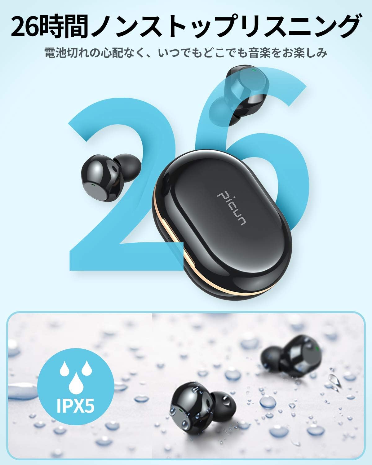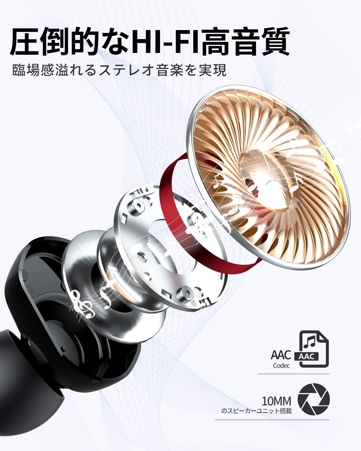 10mm口径というドライバーは完全ワイヤレスイヤホンとしては大きめですが、グラフェンだったりチタンだったり素材にこだわっているわけではないようです。音質はわりと平凡そうな気がします。「gives you the perfect immersive sound, substantial bass, wider sound range, you’ll experience a whole new music world(完璧な没入感のあるサウンド、実体感のある低域、そして広大な音場が感じられ、全く新しい音楽の地平が開けるのを体感できます!)」なんて書いてありますが、個人的には少し胡散臭いです。